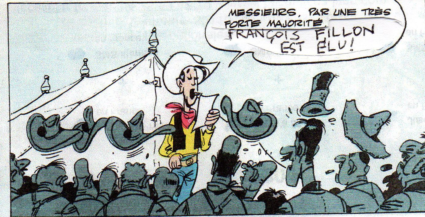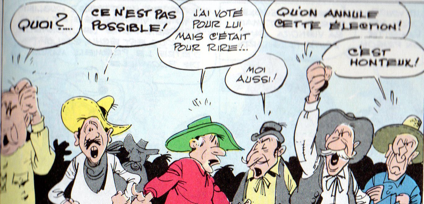 Dans Ruée sur l'Oklahoma, Lucky Luke a pour mission d'organiser des élections. Les favoris étant si écoeurants que, d'un seul homme, sans se concerter, tous les citoyens allèrent voter pour l'idiot du village qui, au moins, lui, présentait l'avantage d'avoir l'air honnête (il était trop bête pour être malhonnête).
