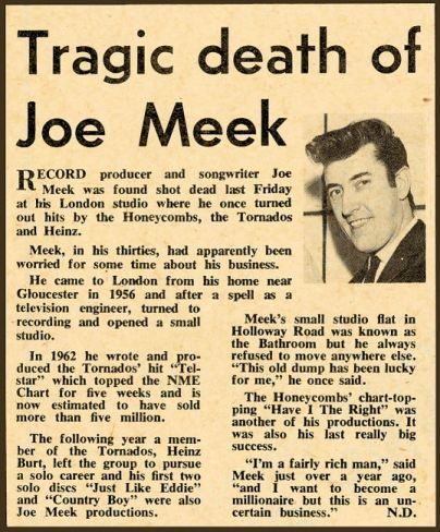 Meek finira tragiquement : ruiné, il se tire une balle dans la tête après avoir trucidé Violet Shenton, propriétaire du magasin situé en dessous de son minuscule studio d'enregistrement. L'évènement prend place en 1967 le jour du 8ème anniversaire de la mort du rocker Buddy Holly... troublant lorsqu'on sait que Joe Meek avait toujours clamé être "habité" par l'esprit de Buddy Holly.